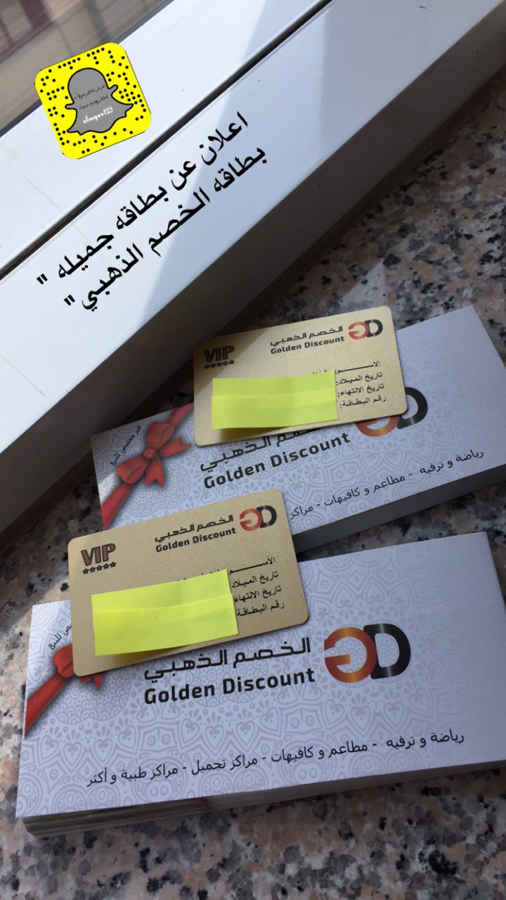 فكرة جيدة و نرغب فى عدد اكبر من محلات الملابس و المطاعم الى الامام و بالتوفيق لكم. بطاقة الخصم الذهبي هي فقط ب 350 ريال للشخص الواحد. افضل نافذة شرائية على الاطلاق لحاملي بطاقة جولدن ديسكاونت. ماهي بطاقة الخصم الذهبي بطاقة الخصم الذهبي هي بطاقه تعطي لحاملها ان كان سعودي الجنسية او غيرها خصومات رائعة ومتنوعة على معظم الاماكن الاساسيه التي يذهب اليها الاسرة واولادها او الاصدقاء كـ المظاعم والنوادي وصالات.