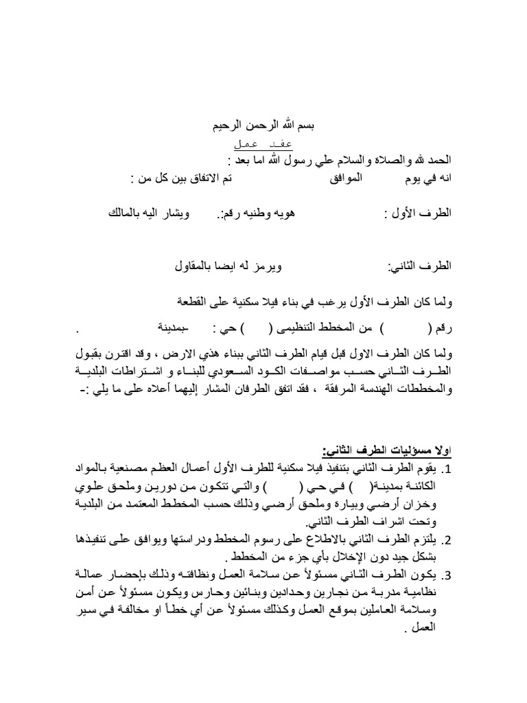 المقاول الإنشائي بسم الله الرحمن الرحيم صيغة عقد بناء عظم بدون مواد.
